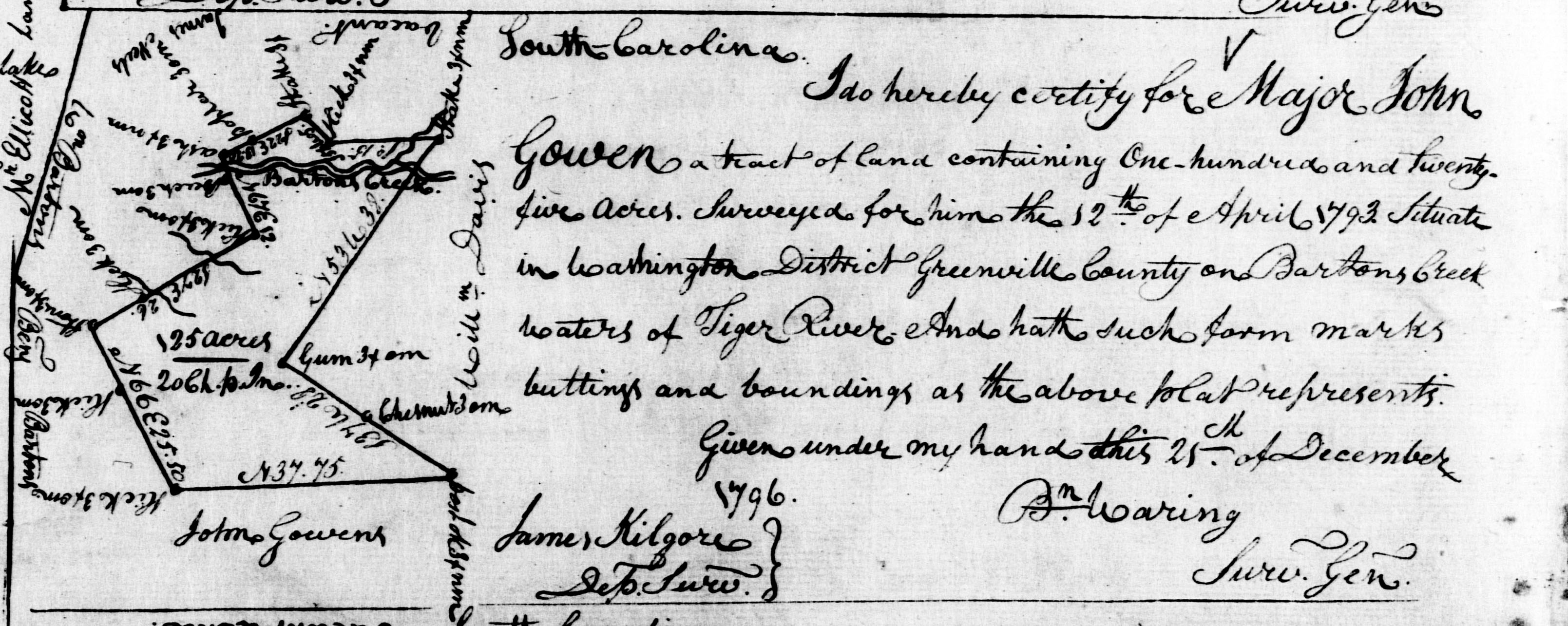 1793 Apr 5 warrant date – John Gowen – warrant date 5 April 1793, 1000 acres in warrant, survey date 12 April 1793, 125 acres in survey, Surveyor – James Kilgore, file 3905, page 391. Land Grants and Surveys Book D, 1788-1799 Greenville Co SC https://www.familysearch.org/ark:/61903/3:1:3Q9M-CS4C-Z3BC-K?i=224&cat=78975