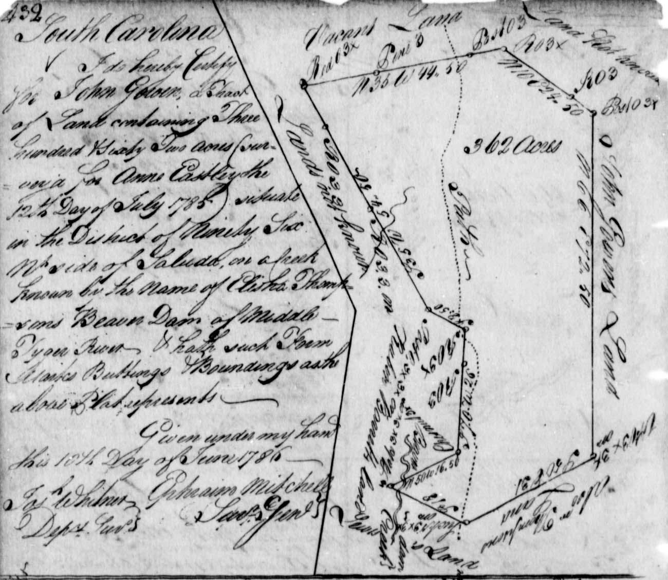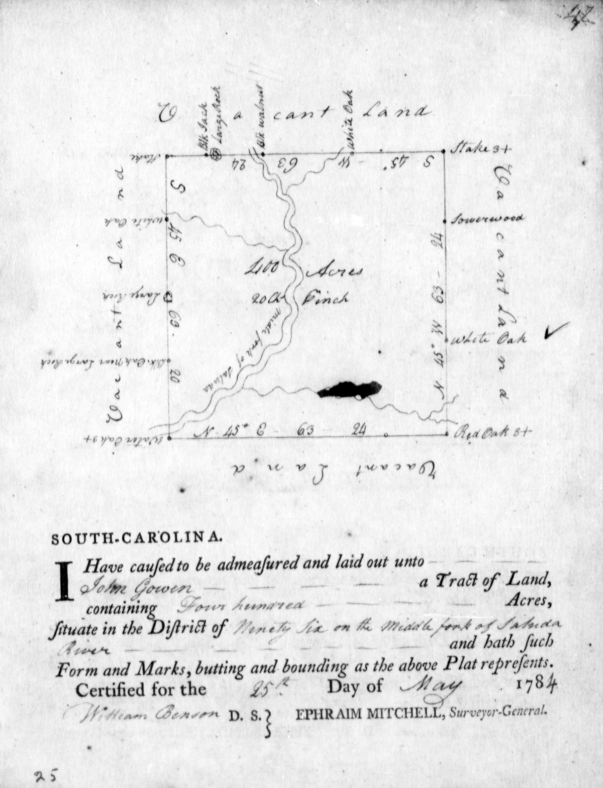 1772 Feb 2 – John Gowen received a royal grant of 100 acres. The survey order was given February 2, 1773, according to”South Carolina Archives, Colonial Plats,” Volume 16, page 173: “South Carolina, Ninety Six District Pursuant to a precept from under the hand and seal of John Bremar, Esquire, Deputy Surveyor General dated February second day, 1773, I have admeasured and laid out unto John Gowan a plantation or tract of land containing one hundred acres situate lying on the North side of Tyger River bounded Eastwardly by Daniel Bush’s land, Northward by vacant land, Westwardly by Tyger river and hath such shape, form and marks as the above plat represents. Given under my hand this 20th day of March, 1773. Andrew Thompson, Deputy Surveyor” 96th Dist, SC