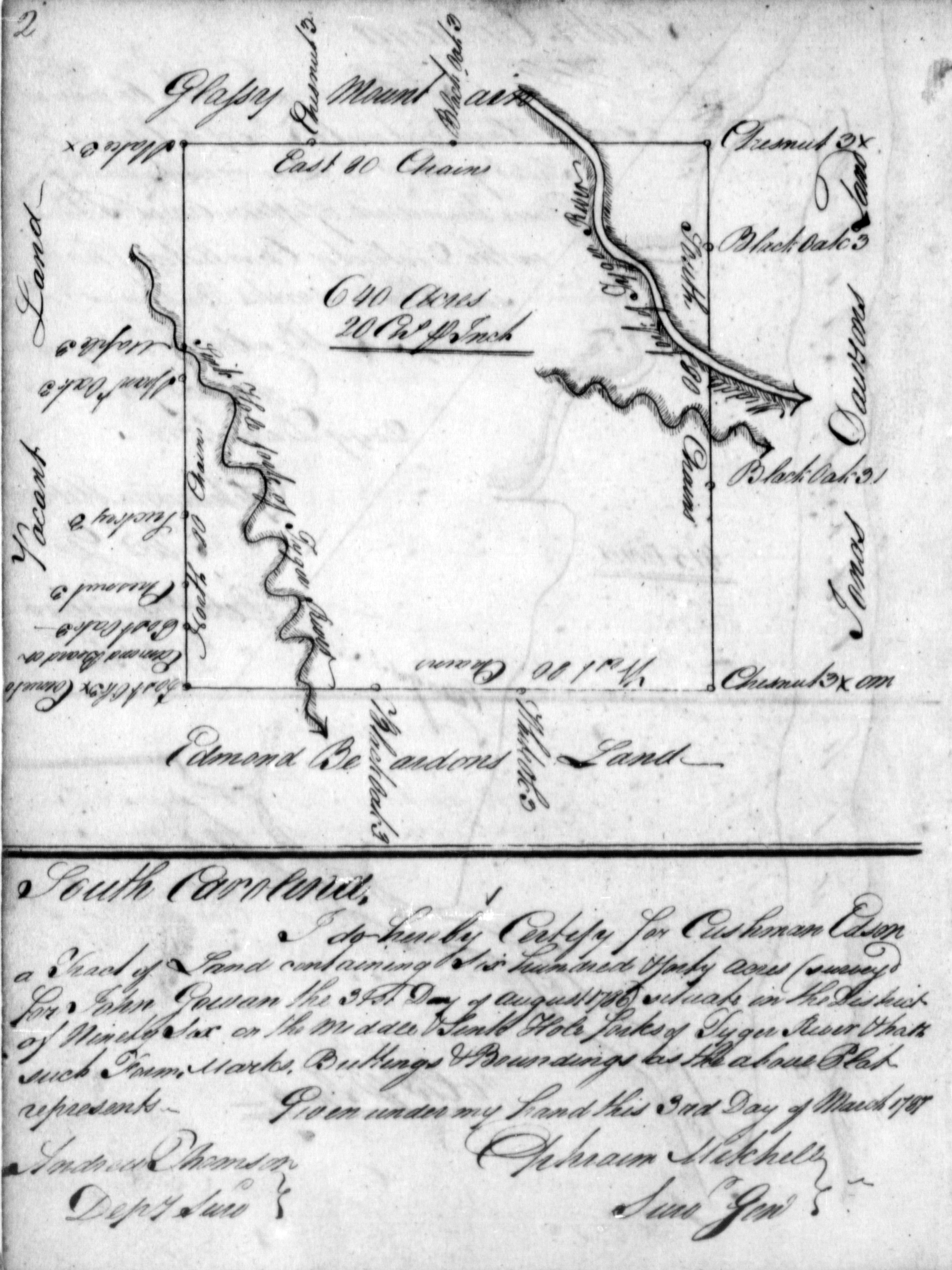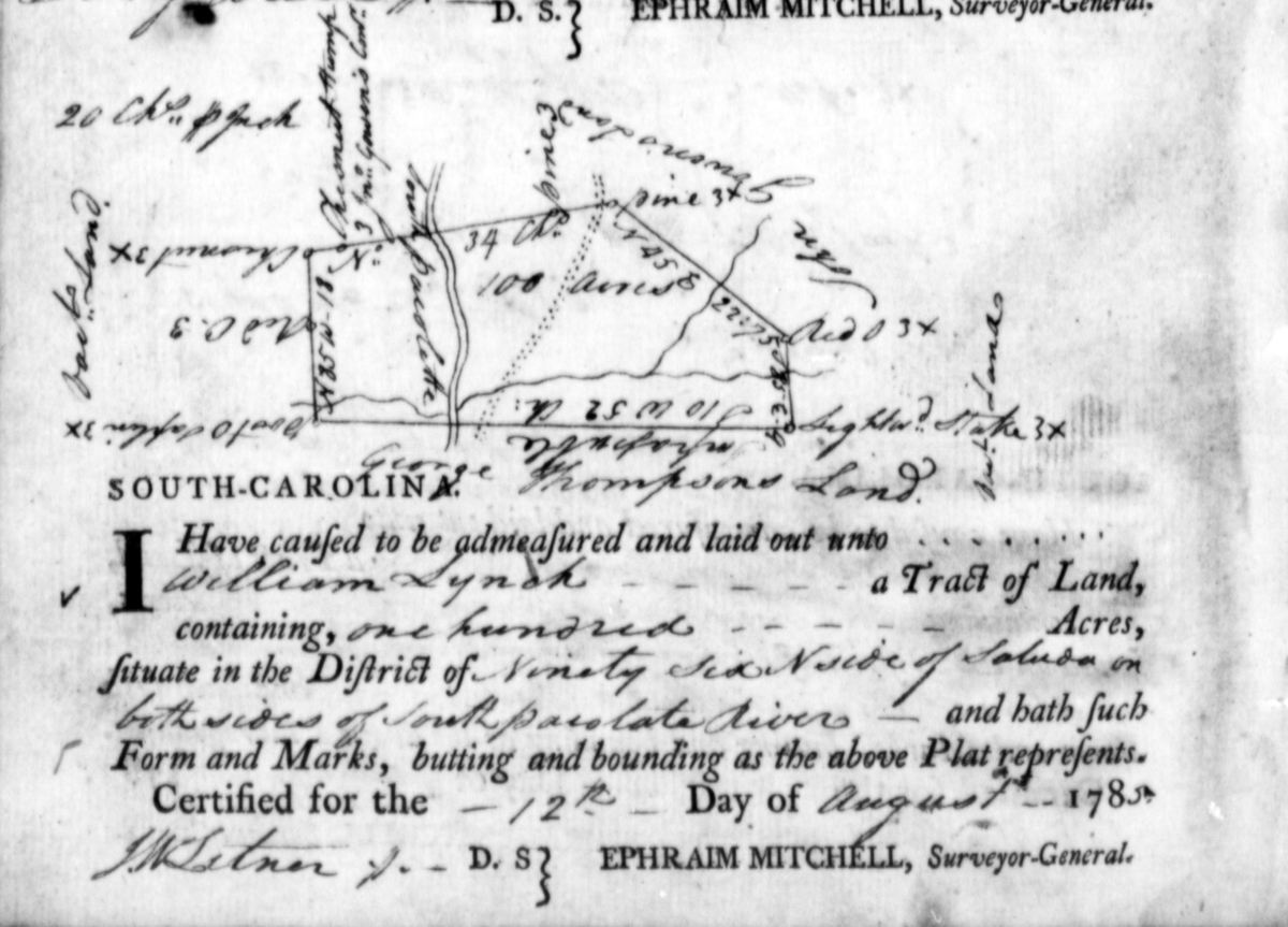 Given under the Great Seal of our Said Province. Witness the Honorable William Bull, Esquire, Lt. Governor and Commander in chief in and over our said Province of South-Carolina, this Nineteenth Day of August Anno Dom. 1774 in the Fourteenth Year of our Reign. [L.M.S.] Williams Bull; Signed by his Honor, the Lt. Governor in Council And hath thereunto a plat thereof annexed, representing the same certified by John Bremar, Deputy Surveyor-General. May 20, 1773. Thomas Winstanley, GCC” Greenville Co., SC
