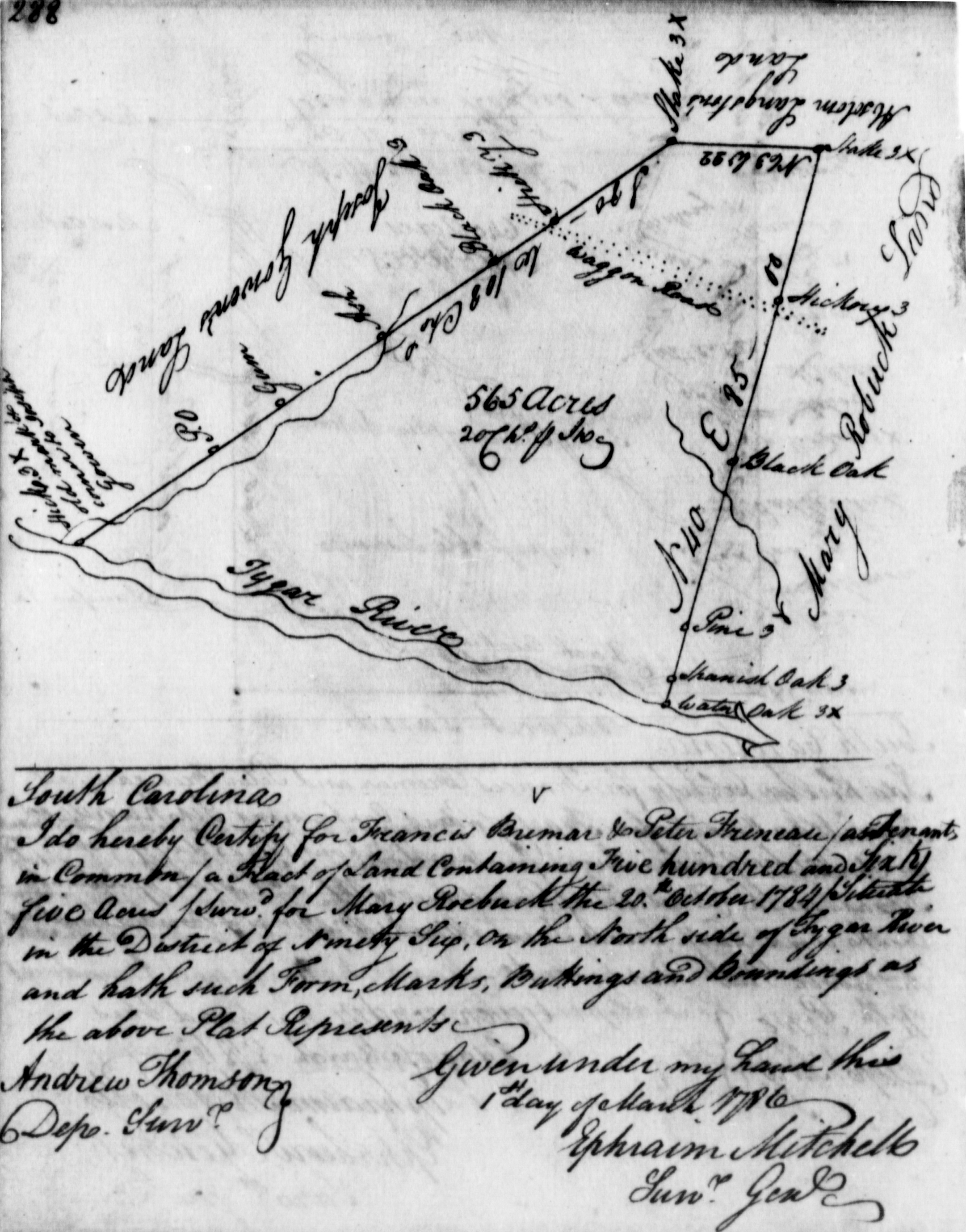 Series: S213184 Volume: 0015 Page: 00157 Item: 02 Names indexed: BREMAR, JOHN; FLATCHER, THOMAS; JOSEPH GOWAN; THOMSON, ANDREW Document type: PLAT Locations: BROAD RIVER; CRAVEN COUNTY; TYGER RIVER, South Carolina.