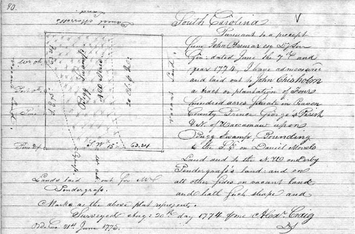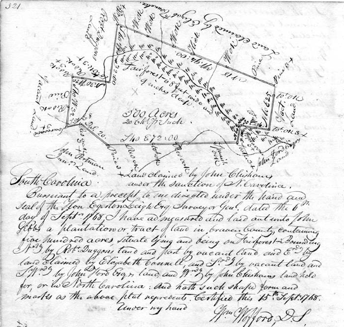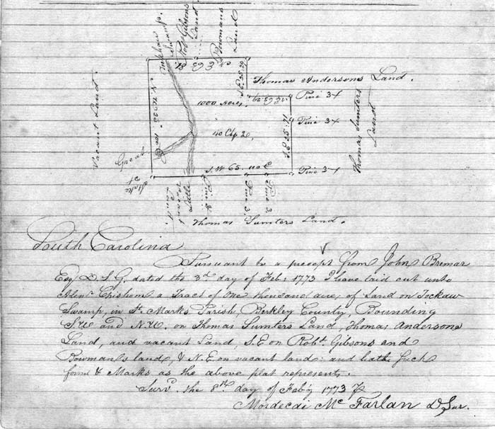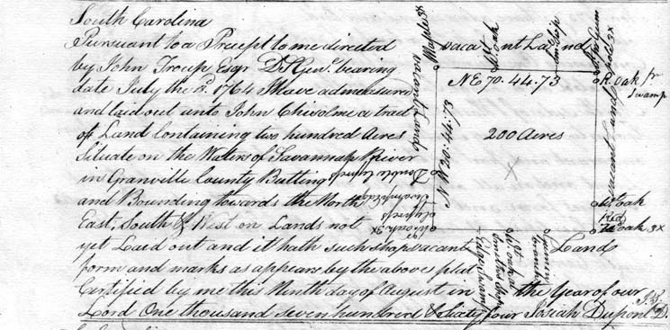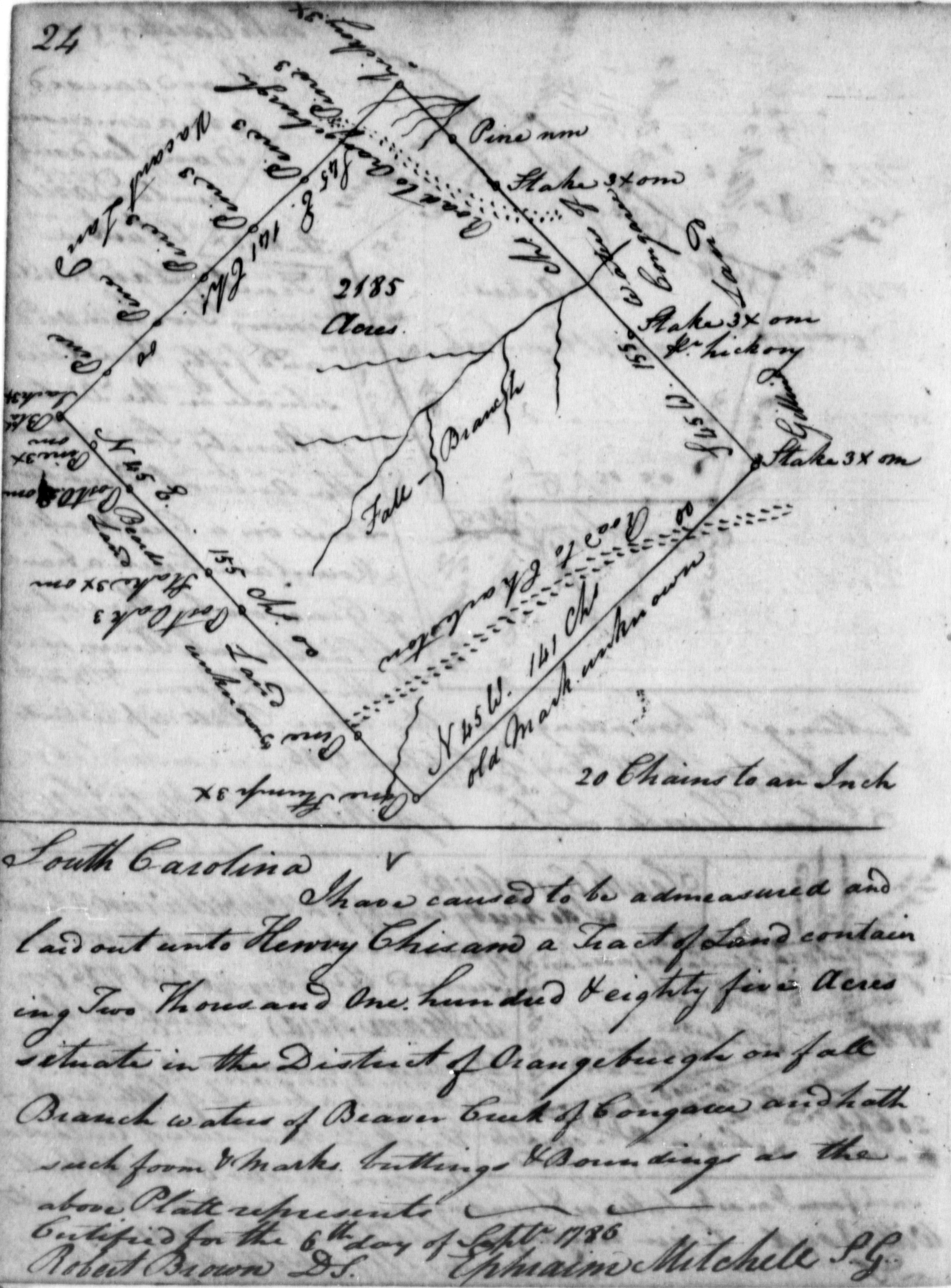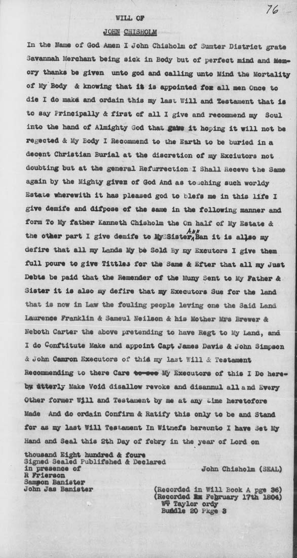 … my son Cornelius D Chisholm and his wife Elizabeth and the children which he now has or which he may hereafter have lawfully begotten … the plantation …. whereon Cornelius Chisholm now lives … on the waters of Fishing Creek containing 135 acres … my daughter in law Elizabeth Chisholm