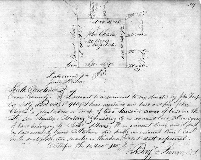(Lease)… between William Hancock of Charles Town in the Proince of South Carolina Merchant of the one part and Alexander Chesolme of said Charles Town vinter of the other part … in consideration of the sum of 5 shillings … sell unto the said Alexander Chisholme … a certain Town Lott … in Charlestown afsd containing half an acre of land … known by the Number 229 butting and bounding to the S upon the Little Street that leadeth from Cooper River formerly by Richard Tradds to George Keeling’s, N upon the lott formerly beloinging to Mr Dugee, E on the Lott formerly belonging to Mr Hill and to the W on a lott formerly belonging to Thomas Rose …