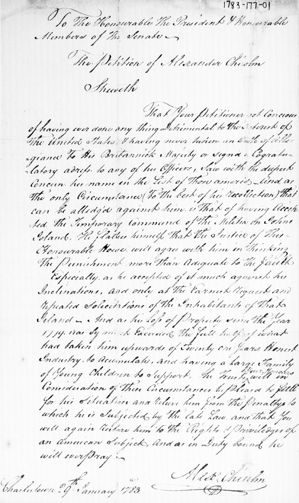 (Release) … 1746 Aug 6 – between William Hancock of Charles Town in the Province of South Carolina merchant of the one part and Alexander Chesolme of Charles Town afsd vinter of the other part … in consideration of the sum of 4400 pounds current money … confirm unto the said Alexander Chesolme … a certain Town Lott … in Charlestown afsd containing half an acre of land … known by the Number 229 butting and bounding to the S upon the Little Street that leadeth from Cooper River formerly by Richard Tradds to George Keeling’s, N upon the lott formerly beloinging to Mr Dugee, E on the Lott formerly belonging to Mr Hill and to the W on a lott formerly belonging to Thomas Rose … was formerly purchased by Elias Hancock of Mr Richard Grinston of Berkly County in the Province of South Carolina Gentleman and Ellinor his wife as by their Deed of Release bearing date the 28 day of February 1726 …
