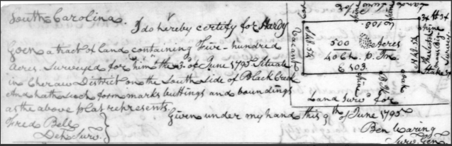 - Hardy Goen in 1795 recd plat for 500 acres on Black Creek in Cheraw Dist SC