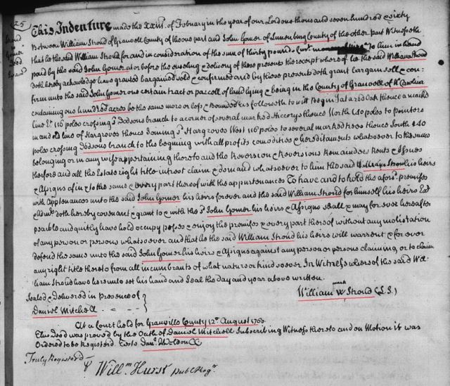 296) 1760 Dec 2: Earl of Granville to William Gowine of Granville County, North Carolina, planter. 650 acres of land located on the Dogwood Spring Branch, bounded by land of Charles Harris. Wits: Thos Jones. Will Hurst. Robt Eyre, Isaac Edwards. Signed: Thomas Child. Proved up by Isaac Edwards in Aug Ct 1762. (Book E p. 440, p 447-448). Granville County, North Carolina. 1760 Dec 2 – William Gowen receives 667 acres adjacent to Johnson, Stovall, in Granville County, NC, 1760 Dec 2 – Title: Gowen, William. Granville Co. Provenance: Class: State Records [Collection]; Group: Secretary of State Record Group; Series: Granville Proprietary Land Office: Granville Grants of Deed; Box: Granville Co.; Years: 1760 Creator: Secretary of State, Office ofGranville Proprietary Land Office Secretary, Office of the; Call Number: SSLG 40A; Location: MFR; MARS Id: 12.13.40.2 (Folder); Genres / Forms: Deeds, Plats, Indexes; Scope / Contents: December 2, 1760 667 acresLocation: Beginning at a pine 2 copies Deed #160; Granville Co, NC. 1760 Dec 2 – William Gowen – Granville County, NC – 667 acs; Adj: Johnson, Stovall, Granville County, NC
