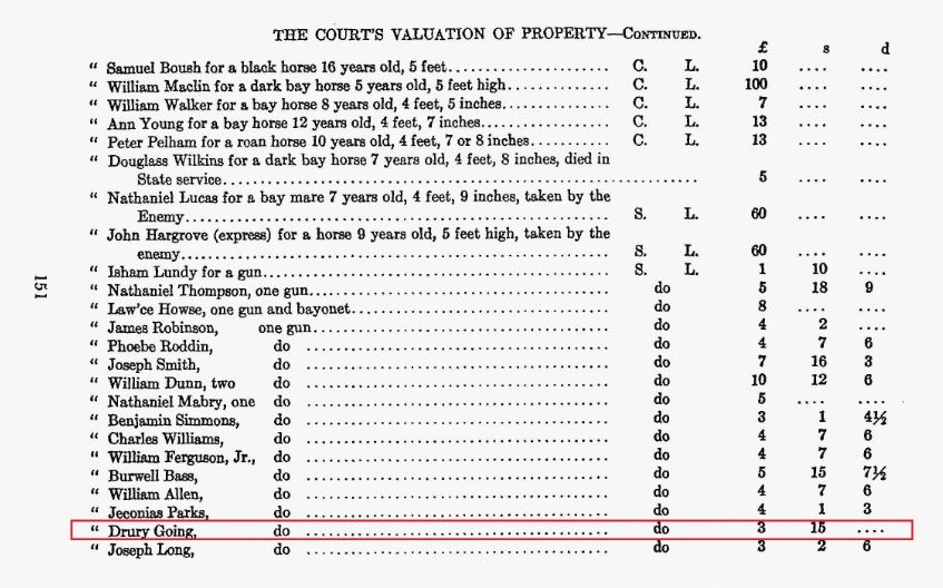 1782 March 12 – Drury Going – Greensville County court credited him with the value of a gun impressed for the public use (during Revolution) [Orders 1781-9, 13-14]. Va. Greensville Co. application for reimb during Revolution. http://www.freeafricanamericans.com/revolution.htm Greensville County court credited Drury Going with the value of a gun impressed for the public use (during the Revolution) [Orders L 781-9, 13-14]. Greensville County, Va.