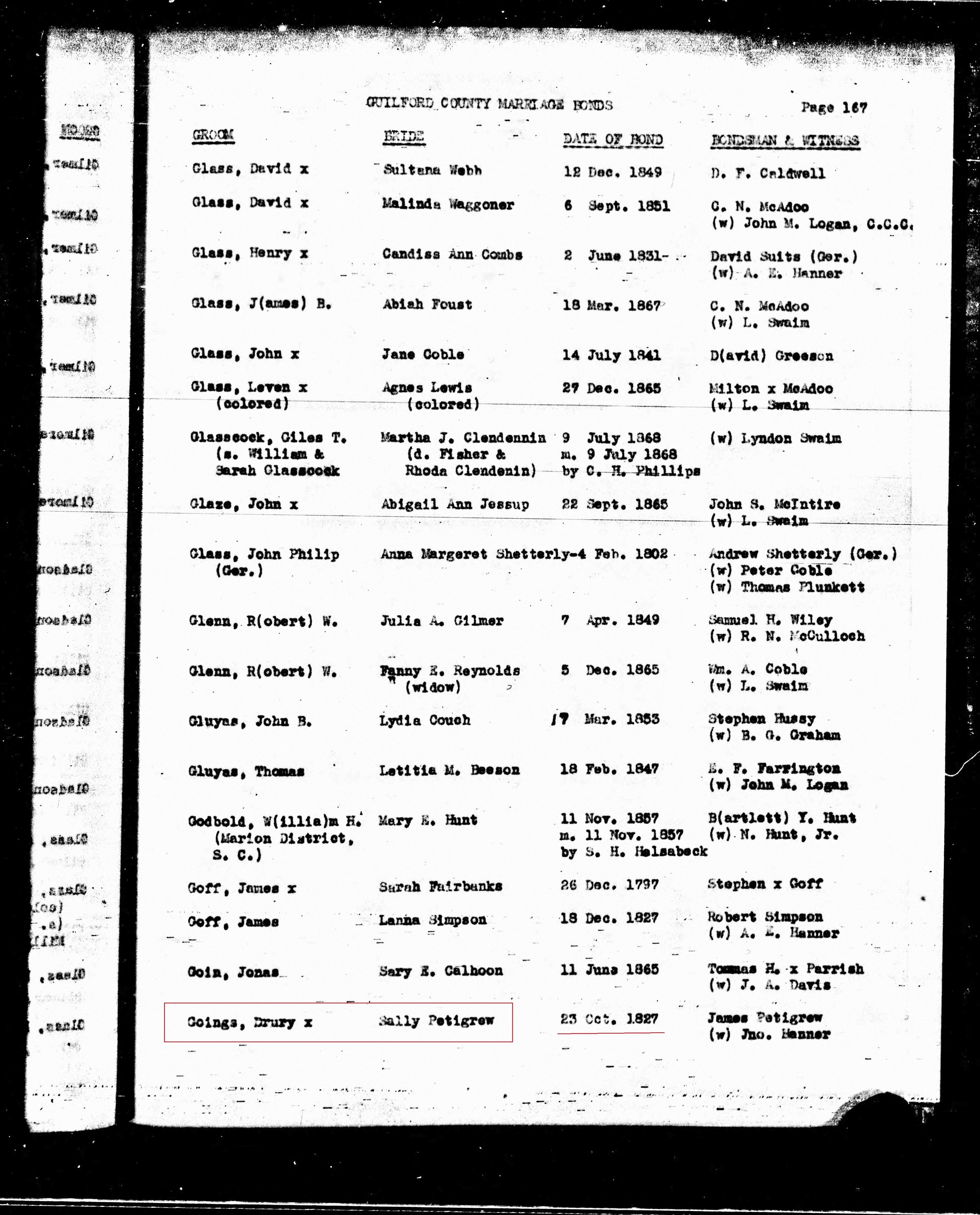 1827 marriage Sally Petigrew in Guilford NC marked