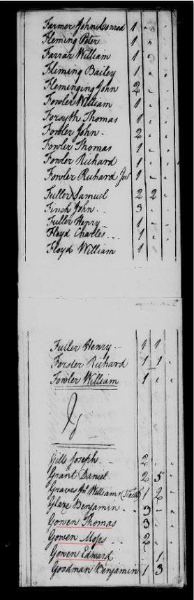 1798 James Gowing senr 1 tithe, 3 slaves over 16, 1 horse [frame 231] Greensville Co Va