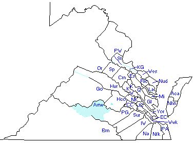 Accomack • Albemarle • Alleghany • Amelia • Amherst • Appomattox • Arlington • Augusta • Bath • Bedford • Bland • Botetourt • Brunswick • Buchanan • Buckingham • Campbell • Caroline • Carroll • Charles City • Charlotte • Chesterfield • Clarke • Craig • Culpeper • Cumberland • Dickenson • Dinwiddie • Essex • Fairfax • Fauquier • Floyd • Fluvanna • Franklin • Frederick • Giles • Gloucester • Goochland • Grayson • Greene • Greensville • Halifax • Hanover • Henrico • Henry • Highland • Isle of Wight • James City • King and Queen • King George • King William • Lancaster • Lee • Loudoun • Louisa • Lunenburg • Madison • Mathews • Mecklenburg • Middlesex • Montgomery • Nansemond – Nelson • New Kent • Northampton • Northumberland • Nottoway • Orange • Page • Patrick • Pittsylvania • Powhatan • Prince Edward • Prince George • Prince William • Pulaski • Rappahannock • Richmond • Roanoke • Rockbridge • Rockingham • Russell • Scott • Shenandoah • Smyth • Southampton • Spotsylvania • Stafford • Surry • Sussex • Tazewell • Warren • Washington • Westmoreland • Wise • Wythe • York