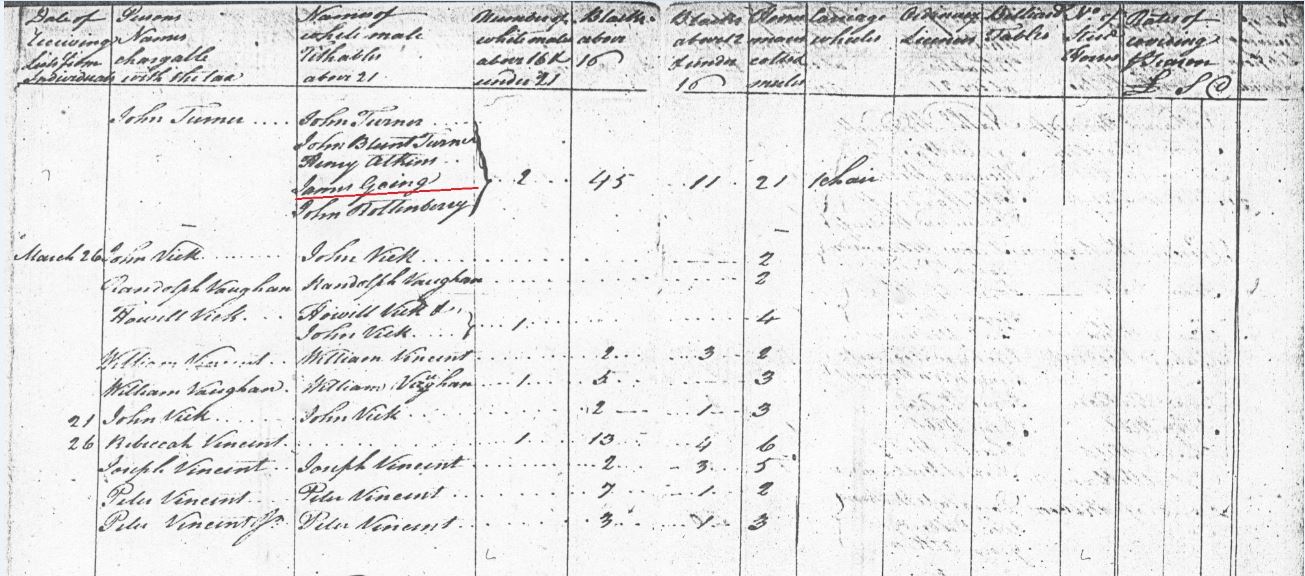 James M Gowing – 1 tithe, 1 slave over 16, 1 slave over 12, 1 horse