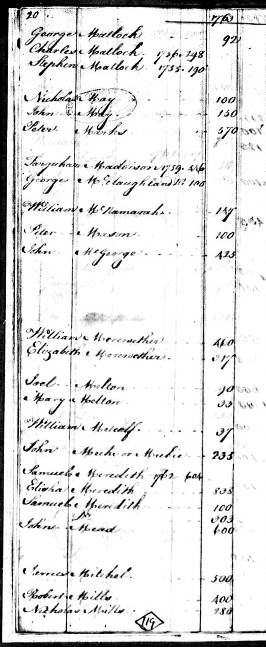 1734 July 5 – In obedience to an order of the Court of Hanover made this 5th day of July 1734 …. have met on a tract of land belonging to David Merywether … on Indian Creek in the County of Hanover … hunded acre and as requi to have valued the … works and improvements and by … examination into the acco’t of expenses find as follows