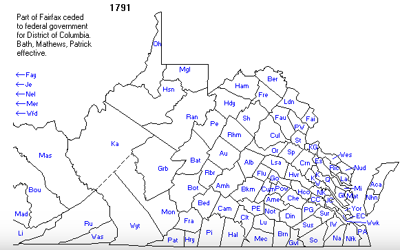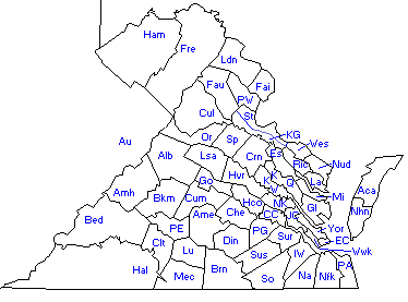 Accomack • Albemarle • Alleghany • Amelia • Amherst • Appomattox • Arlington • Augusta • Bath • Bedford • Bland • Botetourt • Brunswick • Buchanan • Buckingham • Campbell • Caroline • Carroll • Charles City • Charlotte • Chesterfield • Clarke • Craig • Culpeper • Cumberland • Dickenson • Dinwiddie • Essex • Fairfax • Fauquier • Floyd • Fluvanna • Franklin • Frederick • Giles • Gloucester • Goochland • Grayson • Greene • Greensville • Halifax • Hanover • Henrico • Henry • Highland • Isle of Wight • James City • King and Queen • King George • King William • Lancaster • Lee • Loudoun • Louisa • Lunenburg • Madison • Mathews • Mecklenburg • Middlesex • Montgomery • Nansemond – Nelson • New Kent • Northampton • Northumberland • Nottoway • Orange • Page • Patrick • Pittsylvania • Powhatan • Prince Edward • Prince George • Prince William • Pulaski • Rappahannock • Richmond • Roanoke • Rockbridge • Rockingham • Russell • Scott • Shenandoah • Smyth • Southampton • Spotsylvania • Stafford • Surry • Sussex • Tazewell • Warren • Washington • Westmoreland • Wise • Wythe • York
