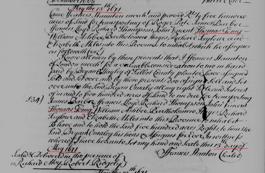 Know all men by these presents that I Francis Staunton of London merchant for a valuable consideration to me in hand paid by Bryan O’Mayley of Talbot County planter have assigned sold and set over and by these presents do assign & sell and set over unto the said Bryan Omaly all my right title and interest of in and to 500 acres of land to me due for transporting: