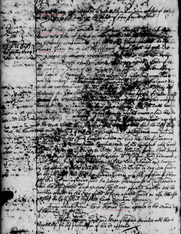 Easher Goeing late of this county being indebted to Mr. Gawen Corbin in the summ of eight hundred and fifteen pounds of tobo by cask as it was said and having absented himself out of the county the sd Corbin obtained an attachment agst the sd Goeings estate by Corbin of which the Sheriff attached one gray horse branded on both buttocks with an obscure brand being the proper estate of the sd Easher Goeing as by the estate of the sd attachmt doth appeare. And for that it appeared to this court by the oath of Mr James Ellis that the sd Easher Goeing stood justly indebted to the sd Gawen Corbin in that sum of amt of tobo by ammt for good judgment is granted him for his sd debt and (sp?) and the sd horse being appraised at Eight hundred pounds of tobo and undemaned awarding (sp?). It is ordered the sheriff orer over him to the sd Mr Corbin in part of satisfaction of his sd debt and such.
