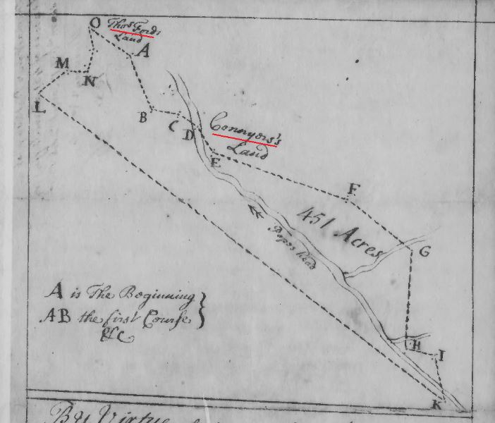 1715 Jan 11, Cornelius Keeife receives 630 acres in Stafford County on the south side of Niapscoe Run … beginning at a marked white oak … on the south side of the run, and on the upper side of a small branch … between the two inward marked hickory’s on the sd run side, being corner tree of a tract of 49 acres of land granted to Dennis Cornwall and now in the possession of the sd Cornelius Keeife, thence along a line of makred trees made for the sd Dennis Cornwall … thence along another of the sd lines south … Survey by Thomas Hooper. Source: Northern Neck Grants No. 5, 1713-1719, p. 34 (Reel 289). https://www.familysearch.org/ark:/61903/3:1:3Q9M-CSYD-VSG1-Z?i=205&cat=414338