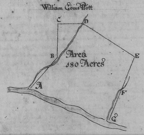 1719 Feb 28 – “William Goin” receives Grant No. 91 for 180 acres … whereas William Goin of Stafford County upon his suggestion of a certain quantity of land …. did obtain a warrant from my office for laying out the same and having now returned a survey thereof under the hand of Mr. Thomas Hooper surveyor … confirm unto the said William Goin 180 acres of land scituate lying and being on the main run of the Accontink Creek in the County of Stafford … bounded … at a corner mark’d white oak standing on the upper side of the mouth of the Long Branch falling into the said main run on the lower side thereof and extending up the said branch North … to a white oak standing on the lower sid of the said branch thence west … to a red oak … to a small maple standing on the upper side of the aforesde Long Branch … to a black oak … to a small Spanish oak standing on the upper side of a small branch called by the said Goin and others Turkey Branch … to a red oak standing near the aforesaid Main Run and on the upper side of the said branch thence down the said Main Run meandering to the several courses and meanders thereof to the beginning … according to “Grants by the Proprietors of the Northern Neck of Virginia, 1694-1742.” Northern Neck Deed Book 5, page 229.