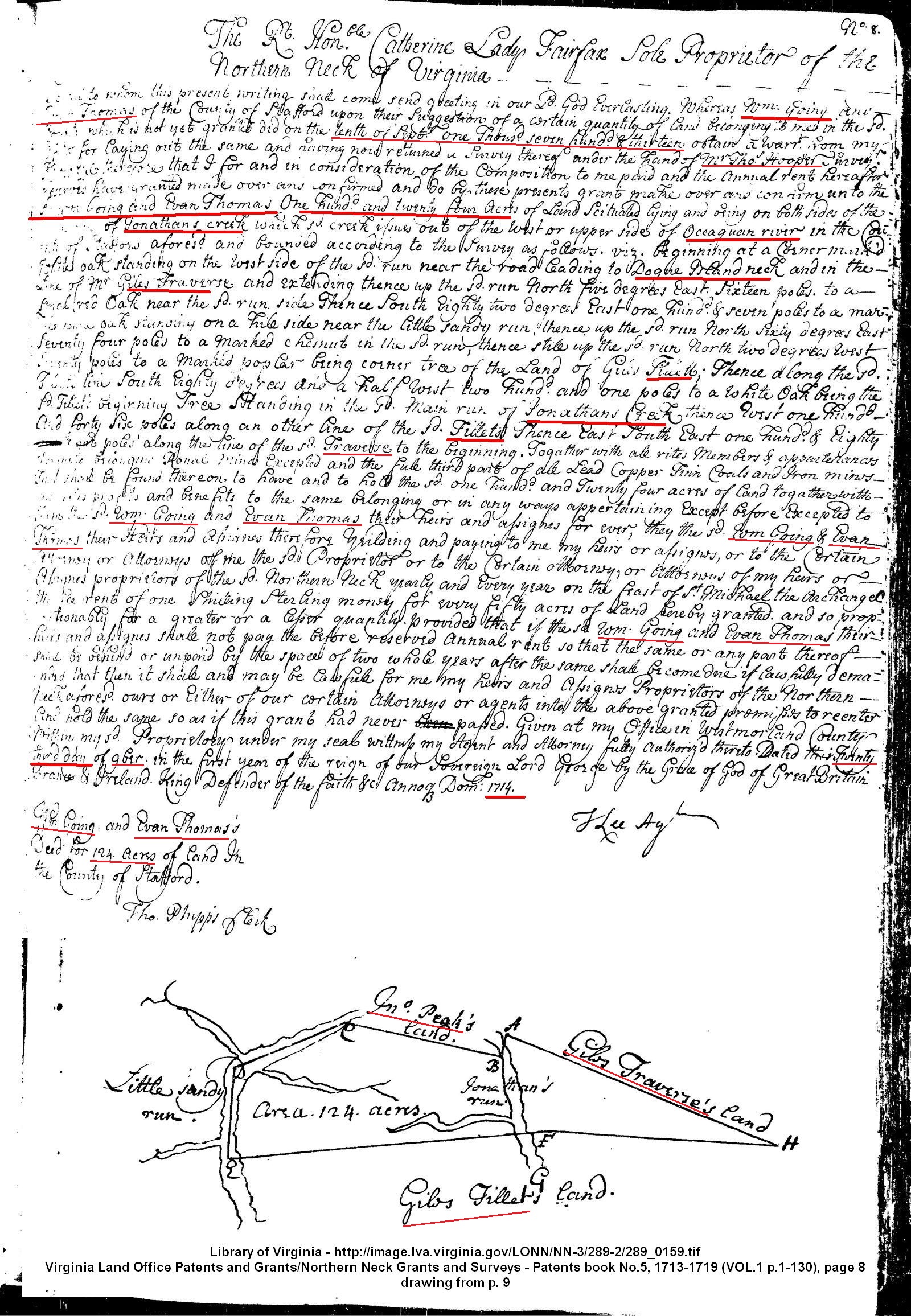 1713 Sept 10 land warrant obtained … On November 23, 1714 William Gowen and Evan Thomas receive a grant of 124 acres in Stafford County from the proprietors, members of the London and Plymouth Companies who receive a grant to all land between the 34th and the 45th parallels, from the Atlantic Ocean to 200 miles inland. At this time William Gowen makes his home in Overwharton Parish of Stafford County. The land is described as “lying on both sides of the main run of Jonathans Creek, which creek issues out of the west or upper side of the road lead of Occoquan River, beginning at a white oak on the west side of the run nearing to Dogue Island neck and in the line of Mr. Giles Traverse,” according to Northern Neck Deed Book 5, page 8. “William Going” and Evan Thomas receive Grant No. 60 for 124 acres November 23, 1714. The land lay in Overwharton Parish “on both sides of the main run of Jonathans Creek, which creek issued out of the west or upper side of Occoquan River, beginning at a white oak on the west side of the run near the road leading to Dogue Island neck and in the line of Mr. Giles’ Traverse … near the Little Sandy Run … corner tree of Giles Tillett … ” according to “Grants by the Proprietors of the Northern Neck of Virginia, 1694-1742.” https://www.familysearch.org/ark:/61903/3:1:3Q9M-CSYD-VSP9-Y?i=160&cat=414338