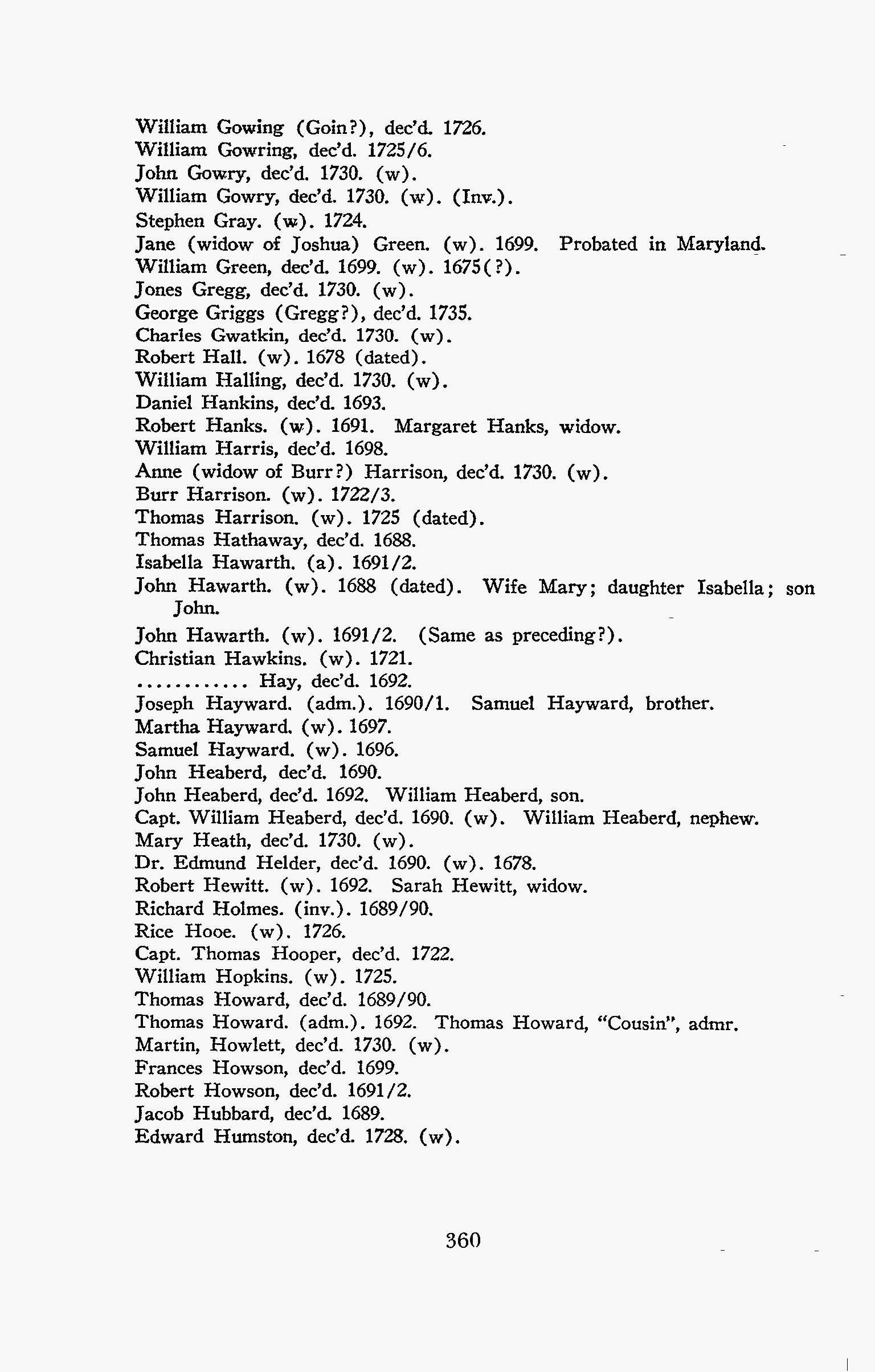 1693 May 31 – Gawen Corbin Gent attachd an attachmt against the estate of Eashaw Goeing for eight hundred and fifty pounds and the sheriff under return that he had it attached one gray horse branded on both buttocks with obscure H brands which a horse has had in custody and a bridle and saddle in the hands of Abraham Smith as being the proper estate of the sd Eashaw Goeing.
