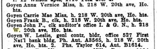 In 1913 W. Leslie Goyen – general contractor, builder, John P. Goyen – clerk auditor’s office, Miss Carrie Mae Goyen, Frank B. Goyen – clerk, and Miss Anna Vernice Goyen are all still listed at 218 W. 20th Ave, Houston Heights – after their father – John Bell Goyen – has died in 1912.