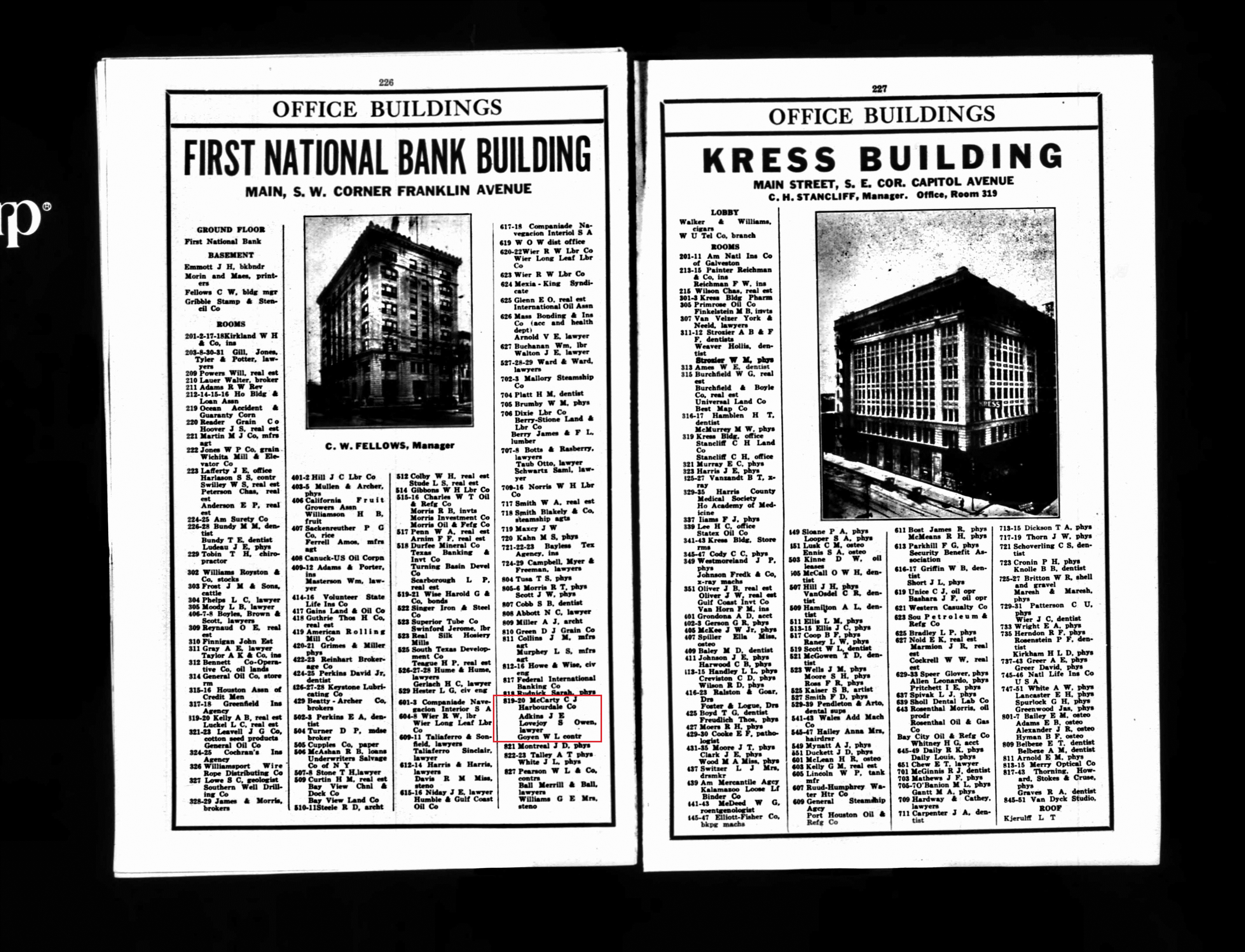 The 1922 and 1923 Houston City Directories show W. L. Goyen to have an office for his contracting work at the First National Bank Building on Main at the SW corner of Franklin Ave.