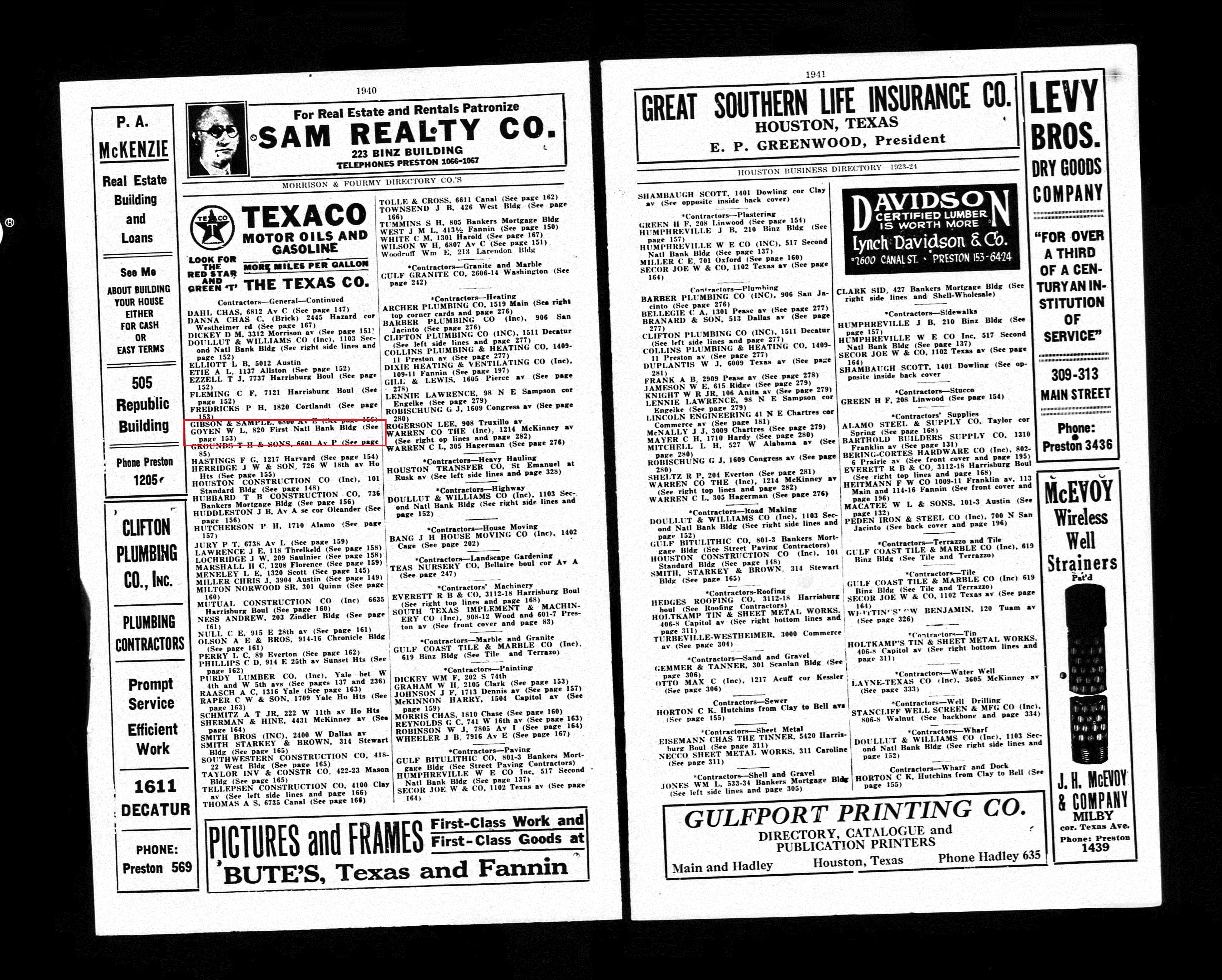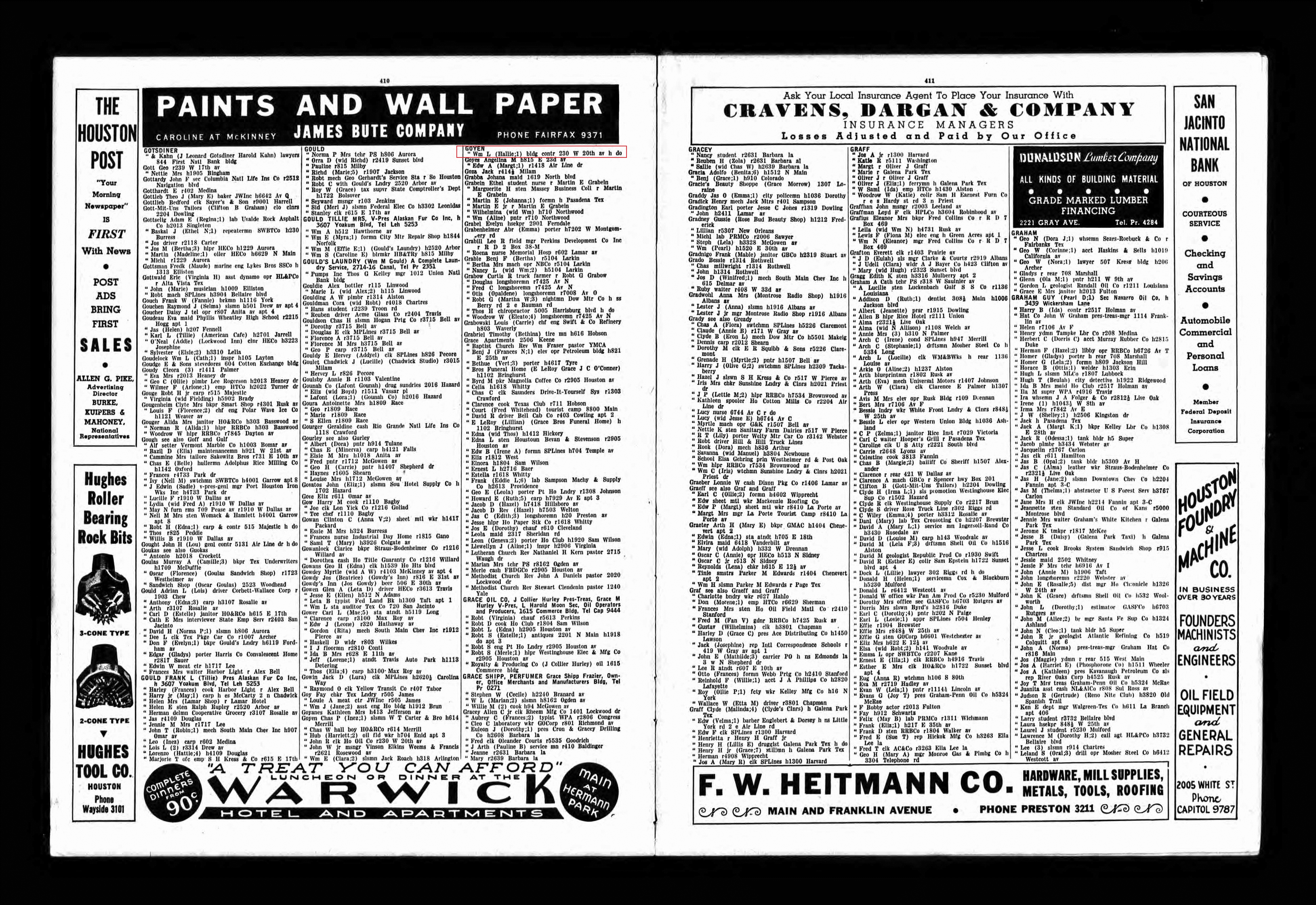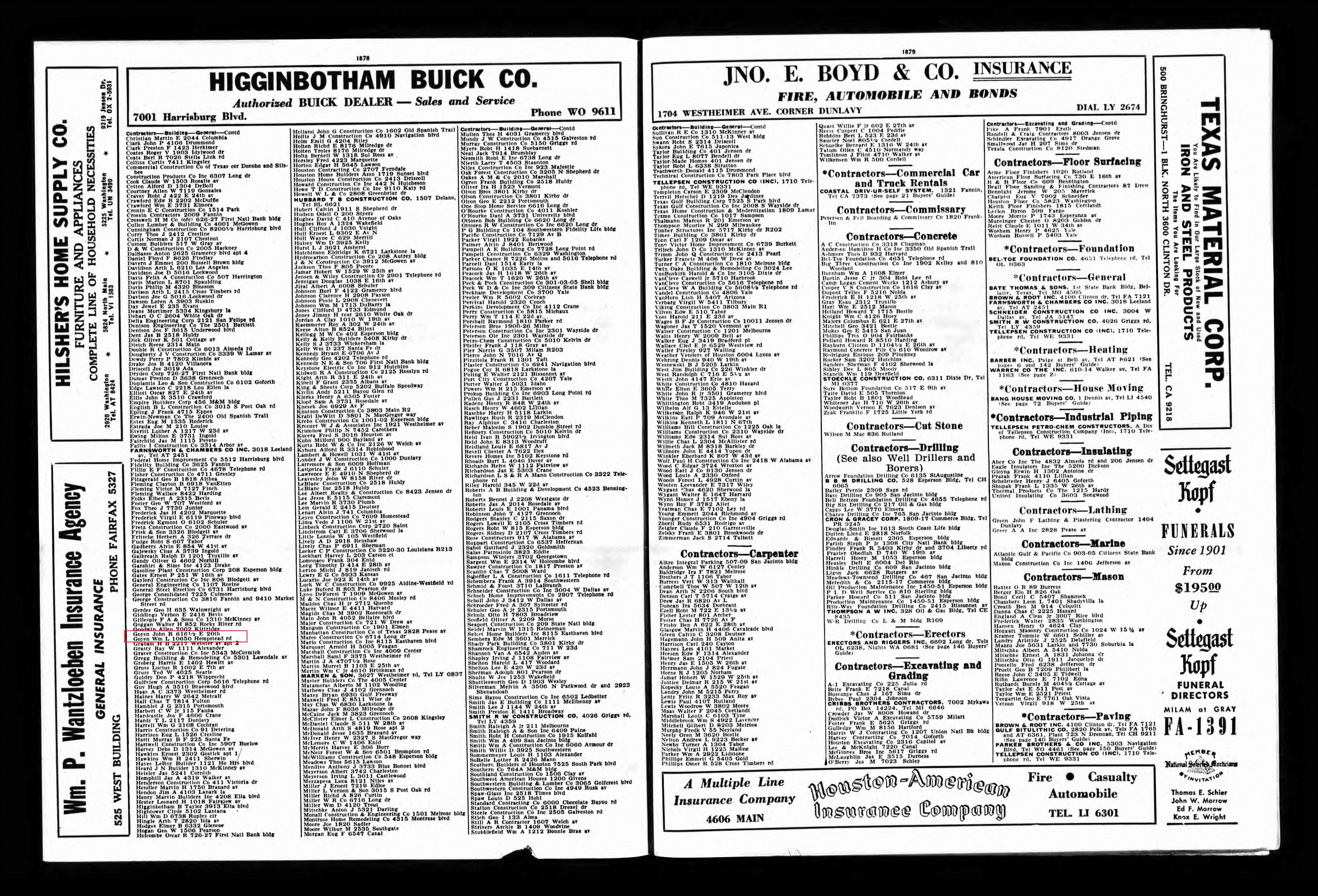 The 1954 Houston City Directory lists contractor W. L. Goyen at 10650 Hempstead Road, Houston, Texas. His son, John R. Goyen is also listed as a contractor, now listed at 616 1/2 E. 20th, Houston, Texas.