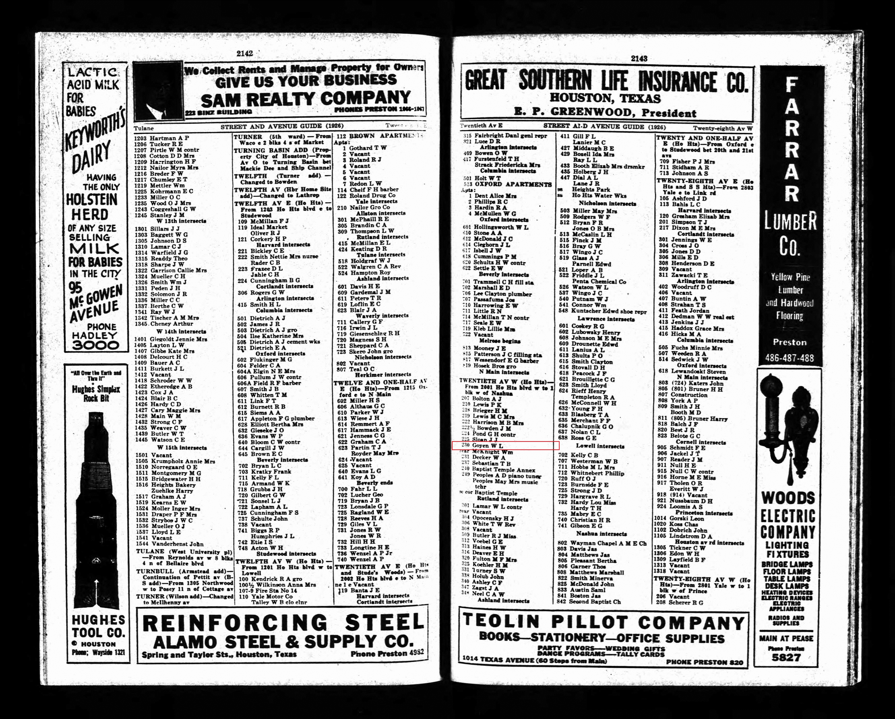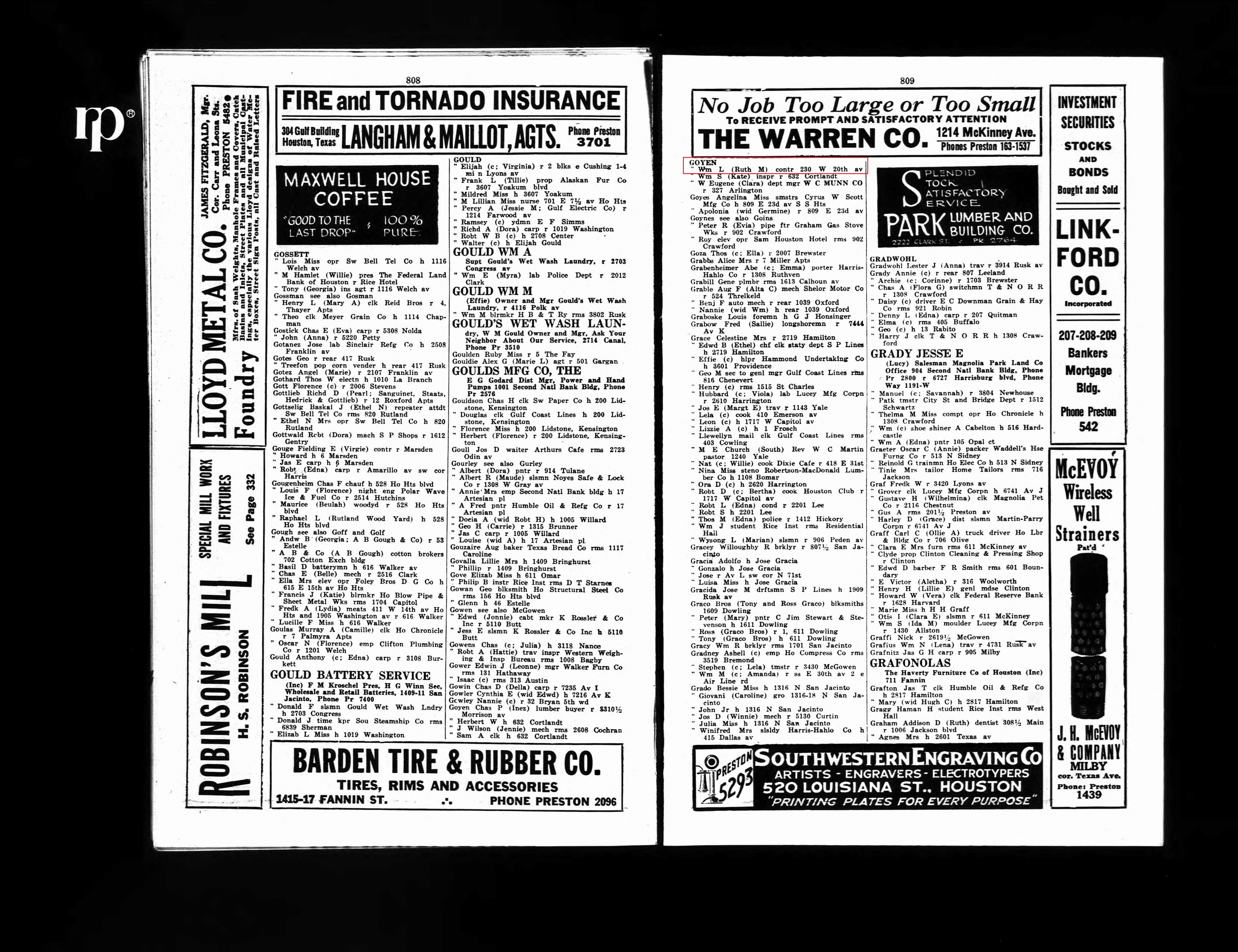 The 1925 and 1926 Houston City Directories list William Leslie Goyen (contractor) and Ruth Marie Goyen’s residence at 230 W. 20th Ave, Houston, Texas.