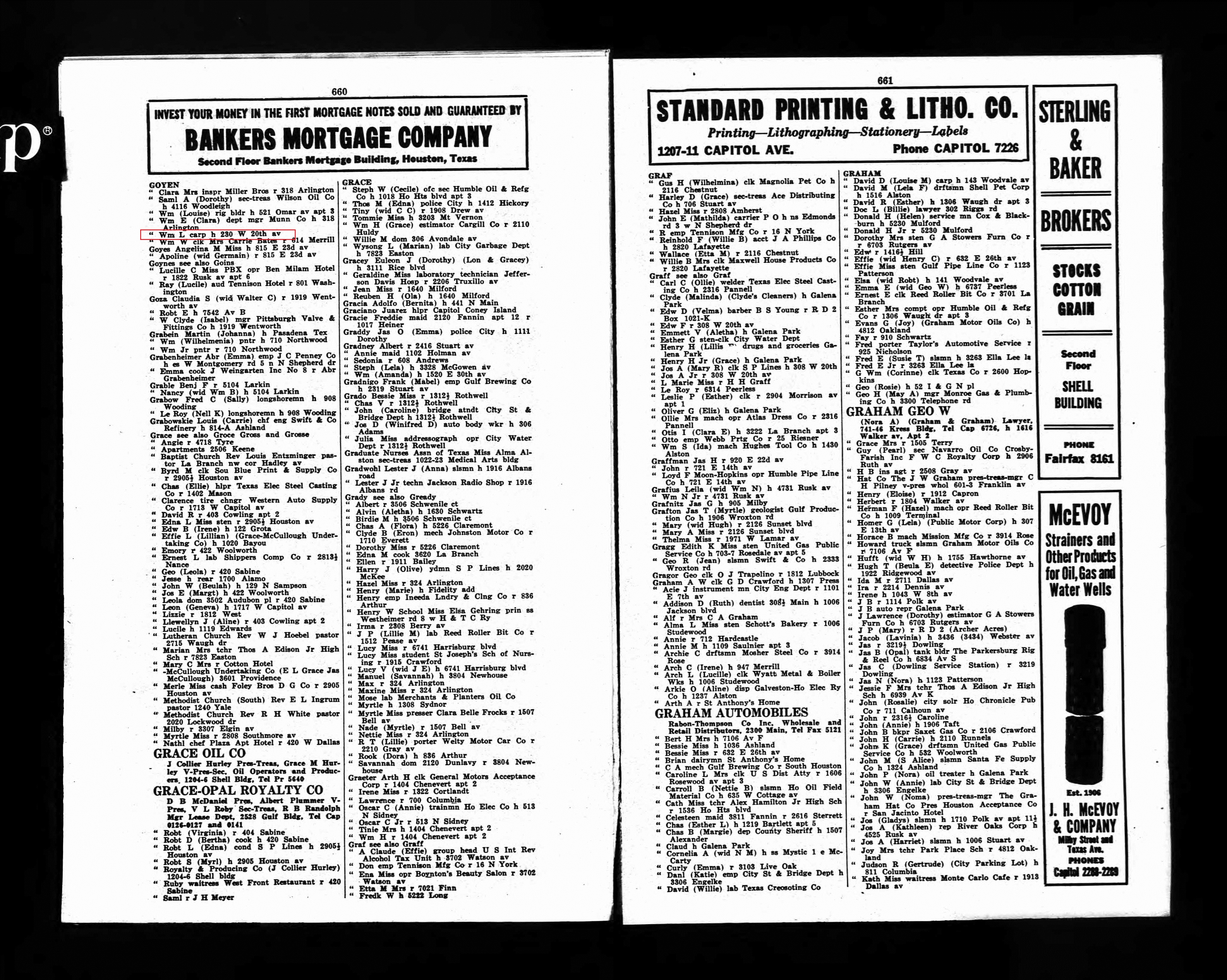The 1935 Houston City Directory lists Wm. L. Goyen “carp” as a home address of 230 W. 20th Ave., Houston, Texas.