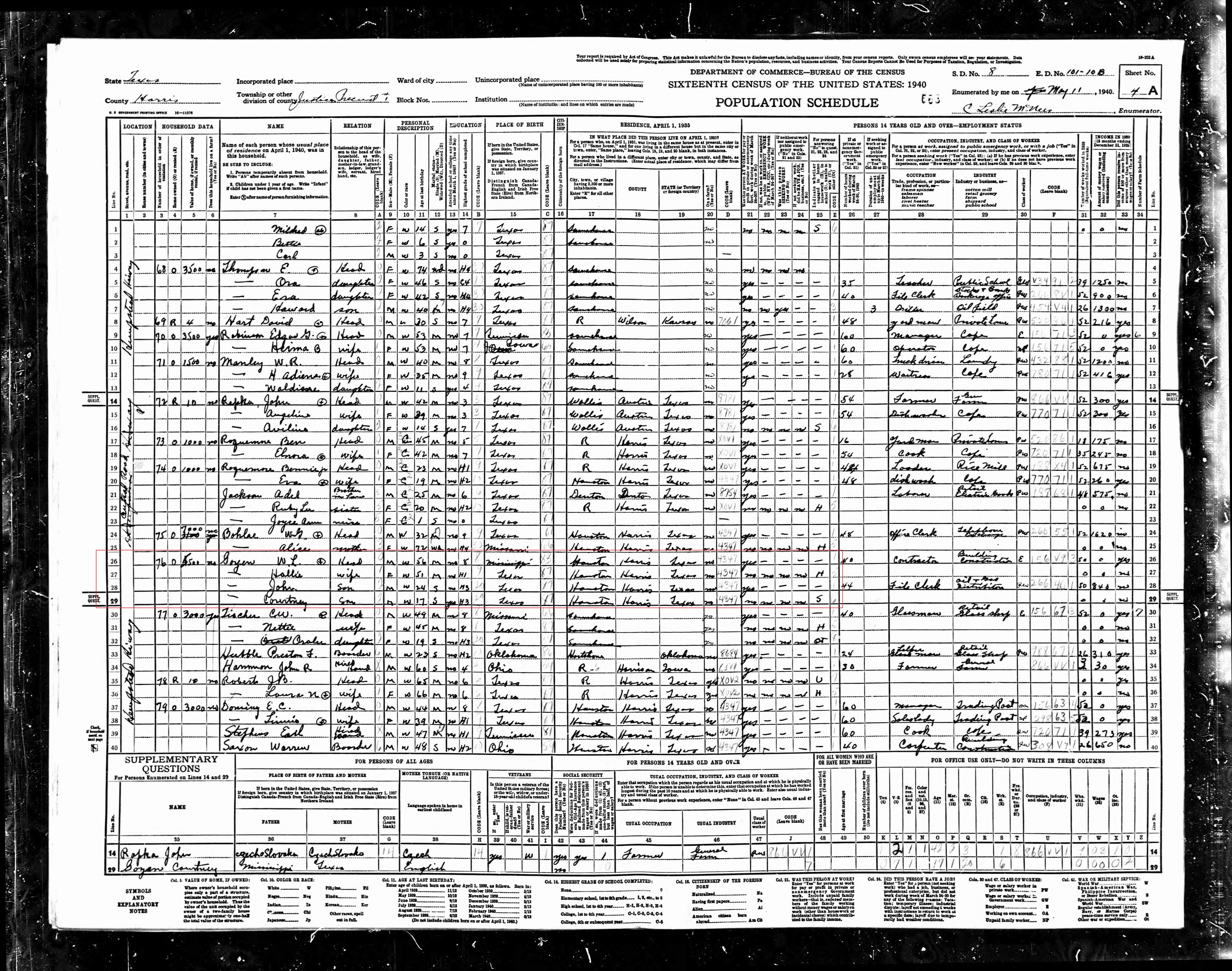 The 1940 US Census in Houston, Texas lists 56 year old W. L. Goyen building contractor as head of household with his wife 51 year old Hallie Goyen. Also living there are 24 year old son John Goyen file clerk in an oil and gas distribution, and 17 year old son Courtney Goyen a student.