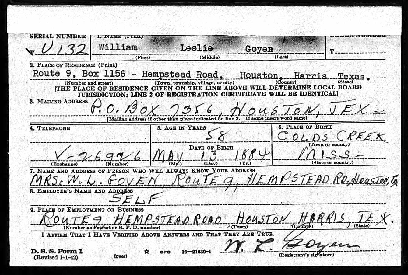 May 21, 1942, 58 year old William Leslie Goyen files his draft registration card during World War II. He lists his and his wife’s address as Route 9, Box 1156, Hempstead Road, Houston, Texas.